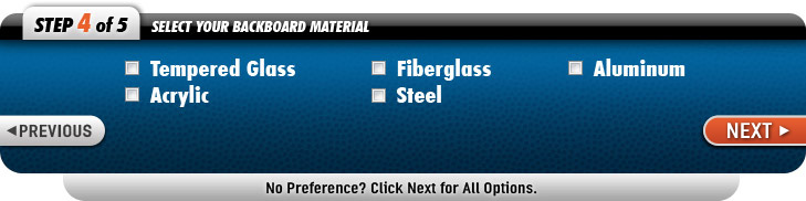 Now tell us what type of backboard you want. Glass is regulation. Acrylic provides the clear look of glass but is basically unbreakable. Fiberglass, steel and aluminum are generally white or metallic color, and can be used in a variety of settings.